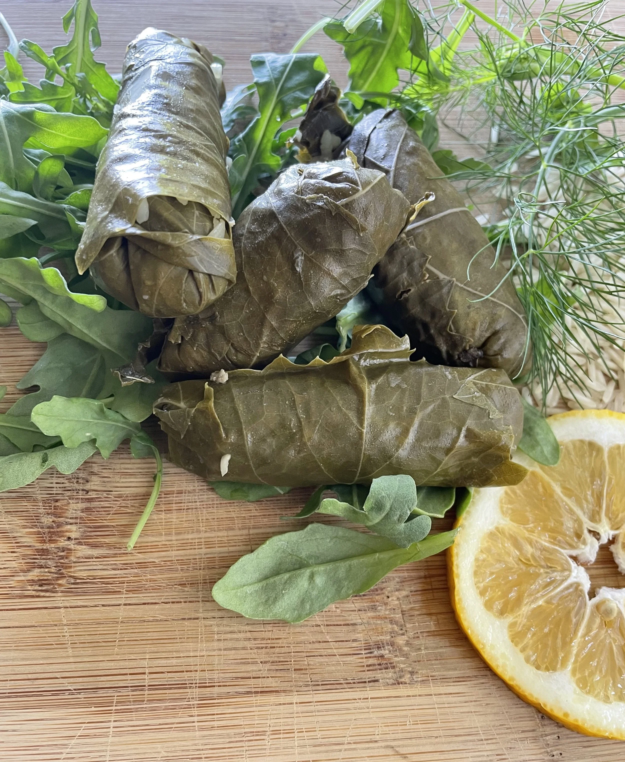 Dolmadakia- Grape leaves stuffed with organic basmati rice and golden onion filling, seasoned with dill, mint and parsley, pine nuts and golden raisins; served with lemon wedges.