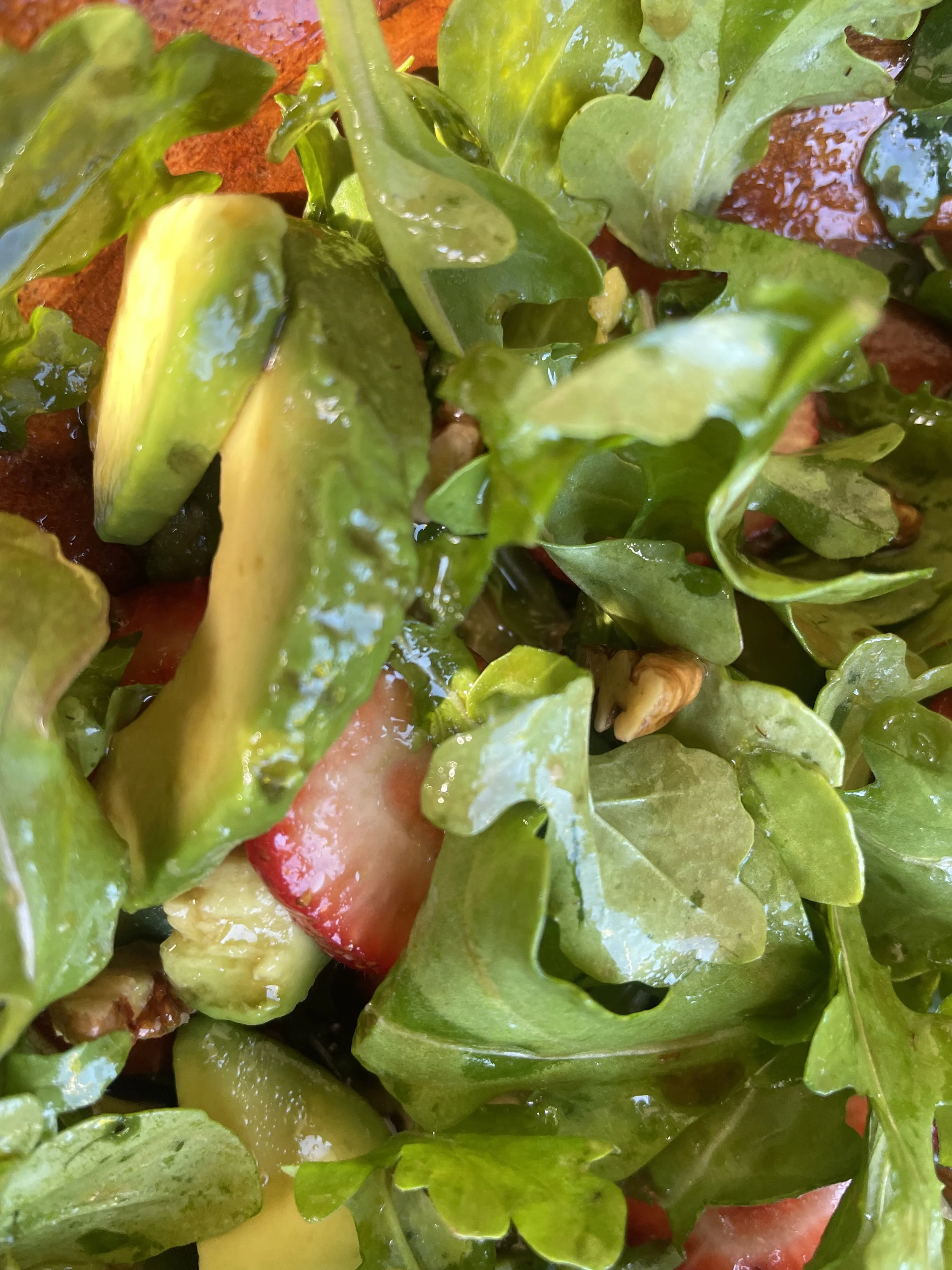 Garden Rocket Salad – Peppery wild arugula mingled with avocado and vibrant strawberry slices, dressed in a bright, house-made vinaigrette with a sprinkle of chopped pecans.