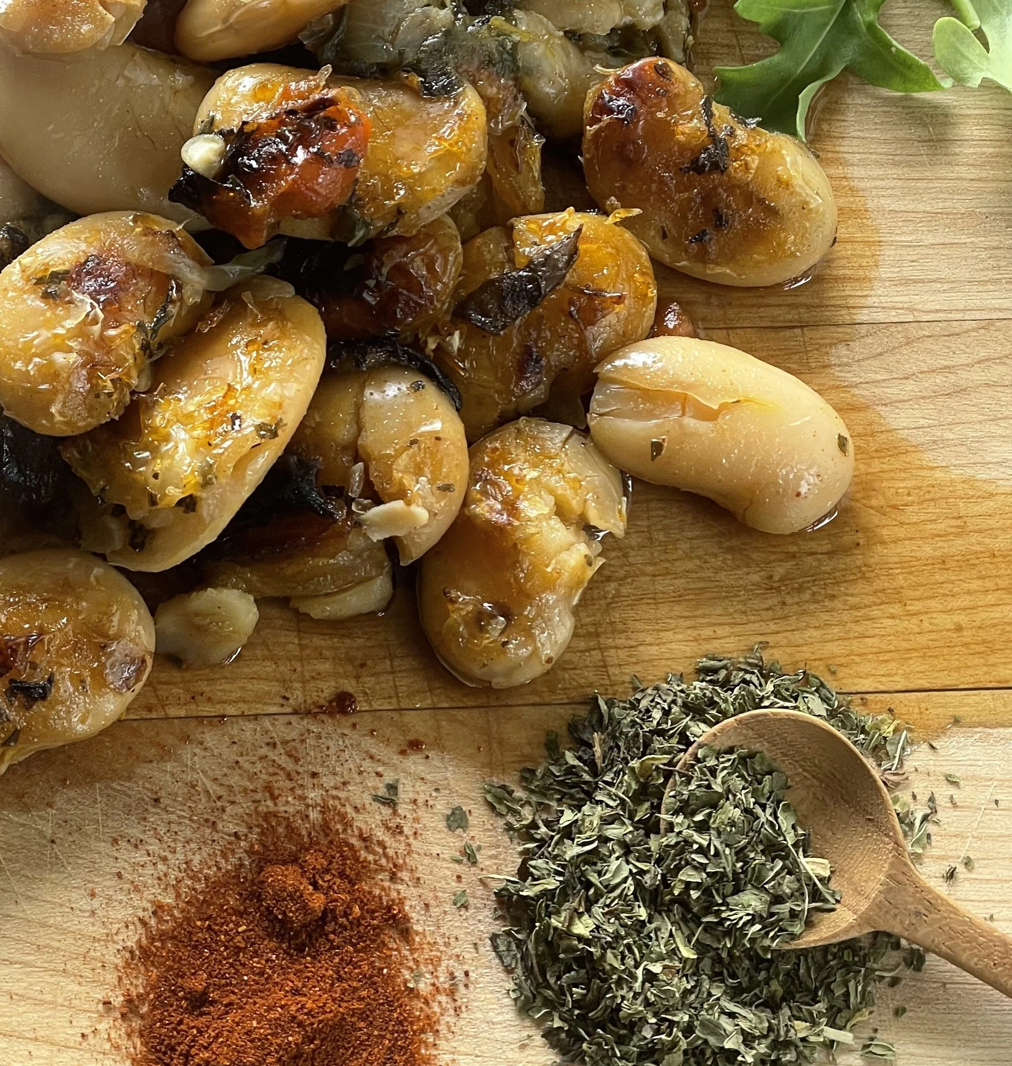 Gigantes – Oven-baked large lima beans in olive oil and herbs, cooked with yellow onions and red bell and poblano peppers, served with a slice of sourdough.