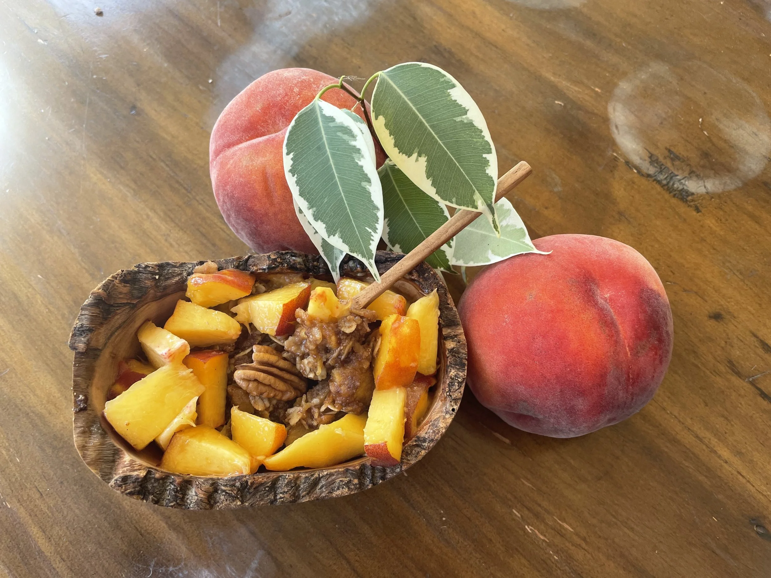 Vegan Peach Crumble - Warm baked peaches with cinnamon, brown sugar, lemon and a crispy oat topping.