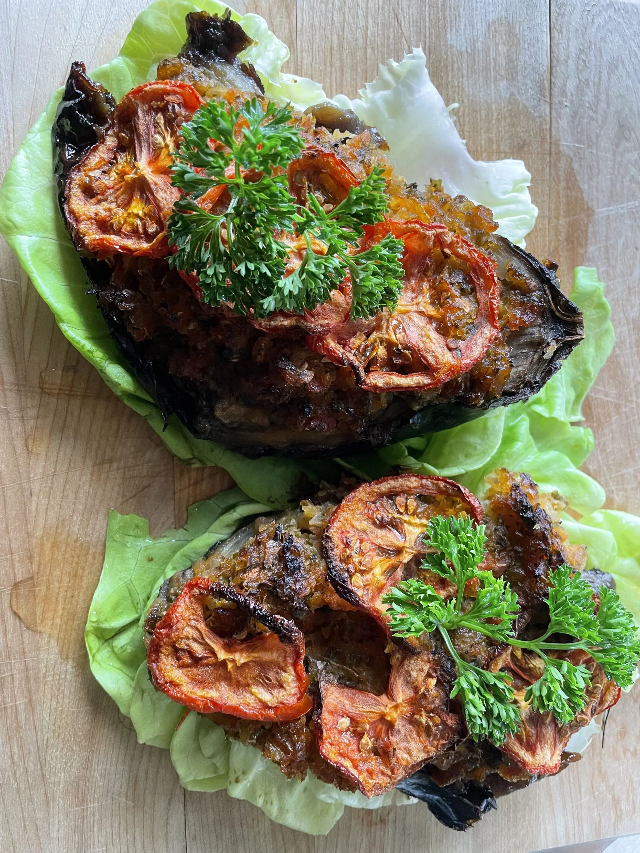 Moussaka, vegan - A vegan version of the traditional moussaka baked casserole, featuring roasted eggplant and a filling of yellow onions, Campari tomatoes and fresh parsley, topped with sliced tomatoes, drizzled in olive oil.