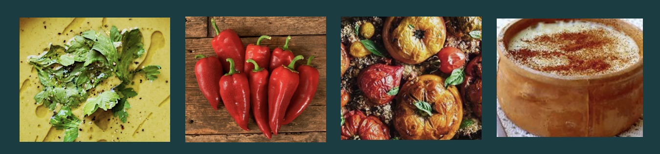 Gemista - Poblano Peppers and Heirloom Tomatoes filled with an organic basmati rice and golden onion filling, seasoned with dill, mint and parsley, pine nuts and golden raisins. Served with a side of plain Greek yoghurt.