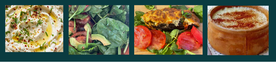 Vegetarian Moussaka - A vegetarian version of the traditional moussaka, featuring roasted eggplant and a filling of yellow onions, Campari tomatoes and fresh parsley, topped with traditional béchamel sauce and a touch of feta cheese. Served with a side of plain Greek yoghurt.